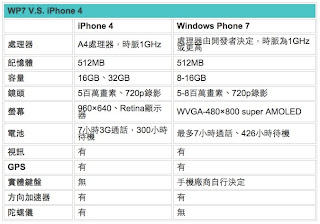 iPhone 4 與 WP7 (Window Phone 7) 規格 比較!